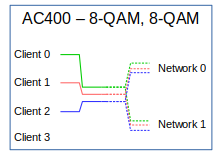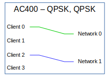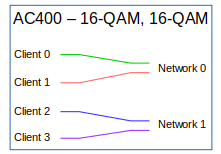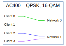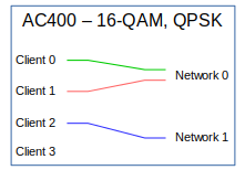 These configurations are combinations of the previous two. The network interface configured for QPSK connects to one client interface and the network interface configured for 16-QAM connects to two client interfaces. |