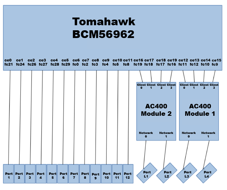 ports.conffile defines the breakout configuration and the/etc/network/interfacesfile defines the other port parameters. When not broken out they are named swp1 thru swp12. - Four duplex LC ports labeled L1 thru L4. L1 and L2 connect to AC400 module 2. L3 and L4 connect to AC400 module 1. Each AC400 module connects to four Tomahawk ASIC ports.