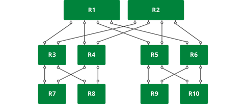In the vast majority of modern data centers, Clos or fat tree topology is very popular. This topology is shown in the figure below. It is also commonly referred to as leaf-spine topology. We shall use this topology throughout the routing protocol guide.