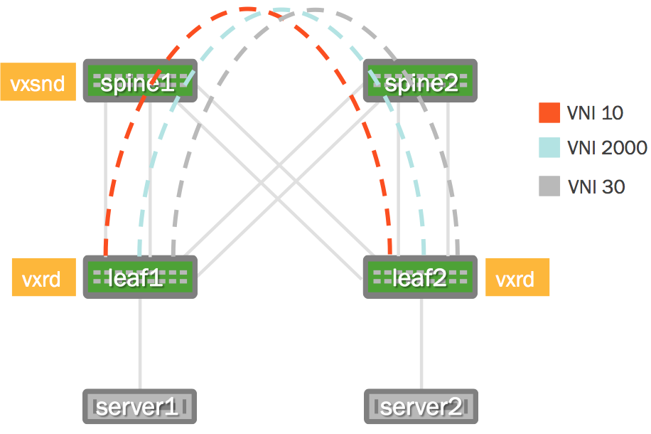 - An SVI (Switch VLAN Interface) or layer 3 address on the bridge is not supported. For example, you cannot ping from the leaf1 SVI to the leaf2 SVI through the VXLAN tunnel; you need to use server1 and server2 to verify.