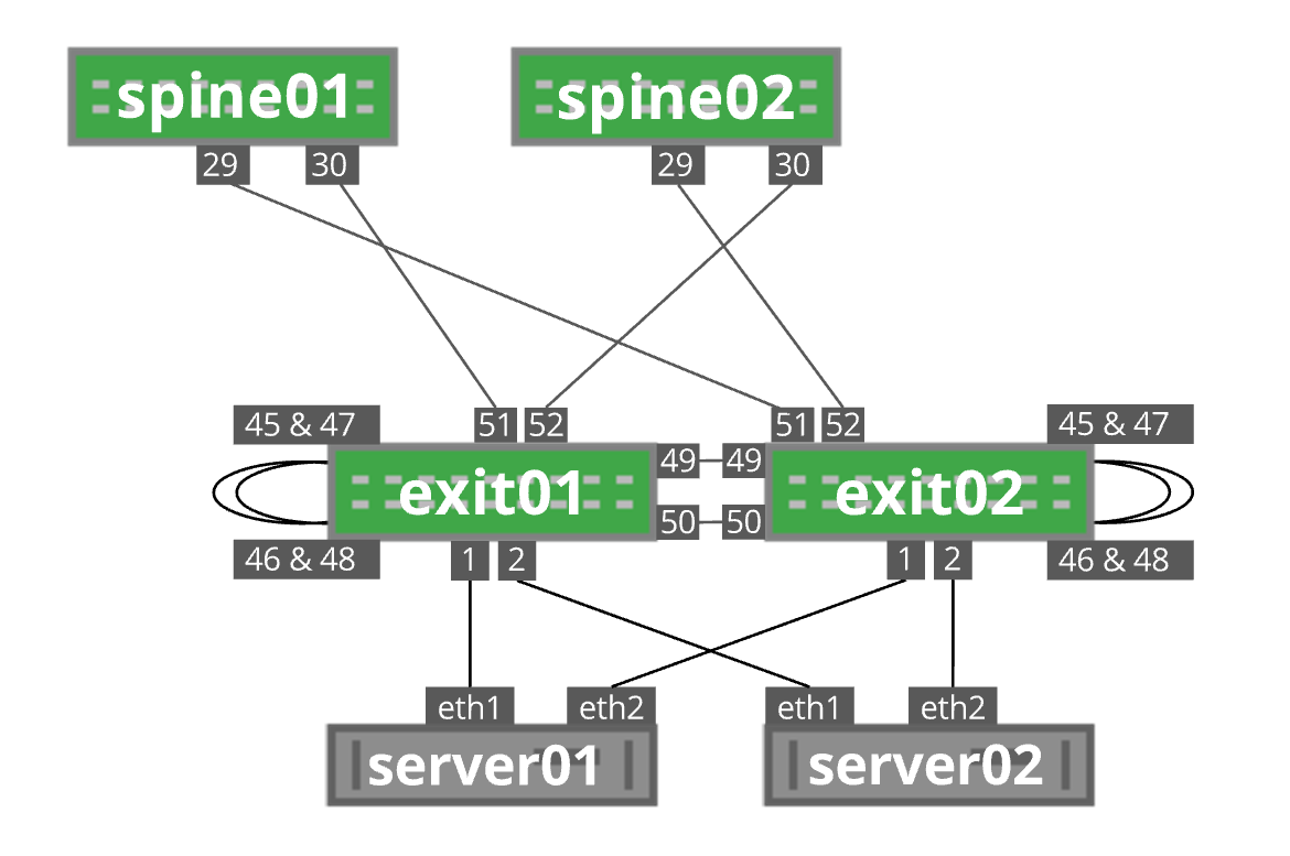 In the above diagram, VTEPs exit01 and exit02 are acting as VXLAN layer 3 gateways. On exit01, two pairs of ports are externally looped back (swp45, swp46) and (swp47, swp48). The ports swp46 and swp48 are bonded together and act as the layer 2 end; therefore, this bond interface (named inside) is a member of the bridge. The ports swp45 and swp47 are bonded together (named outside) and act as the layer 3 end with SVIs configured for VLANs 100 and 200 with the corresponding gateway IP addresses. Because the two layer 3 gateways are in an MLAG configuration, they use a virtual IP address as the gateway IP. The relevant interface configuration on exit01 is as follows: