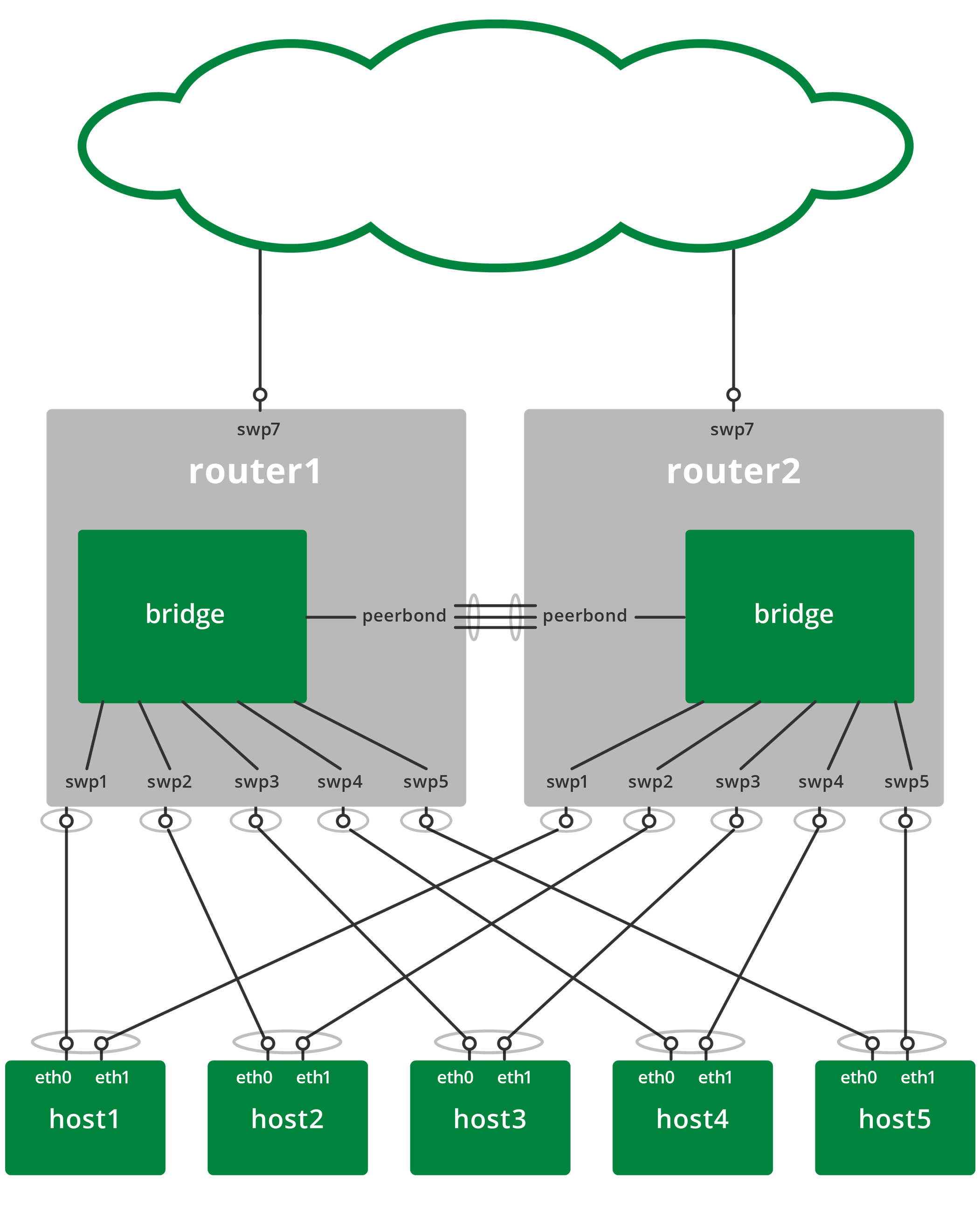 The network includes several hosts and two routers running Cumulus Linux that are configured with multi-chassis link aggregation (MLAG).