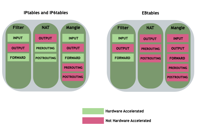 Each table has a set of default chains that can be used to modify or inspect packets at different points of the path through the switch. Chains contain the individual rules to influence traffic. Each table and the default chains they support are shown below. Tables and chains in green are supported by Cumulus Linux, those in red are not supported (that is, they are not hardware accelerated) at this time.