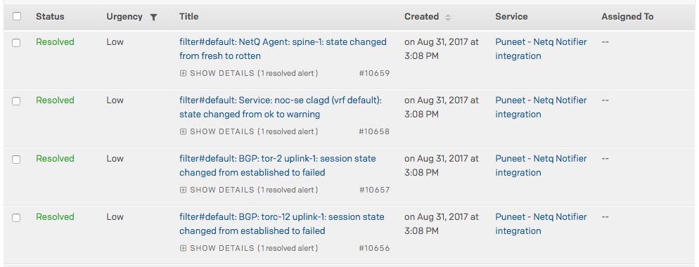 To take advantage of the numerous event messages generated and processed by NetQ, you must integrate with third-party event notification applications. You can integrate NetQ with Syslog, PagerDuty and Slack tools. You may integrate with one or more of these applications simultaneously.