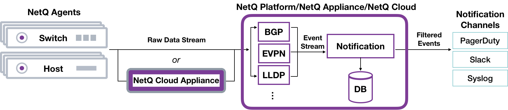 Each network protocol and service in the NetQ Platform receives the raw data stream from the NetQ Agents, processes the data and delivers events to the Notification function. Notification then stores, filters and sends messages to any configured notification applications. Filters are based on rules you create. You must have at least one rule per filter. A select set of events can be triggered by a user-configured threshold.