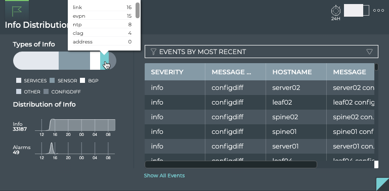 While you can see the relative relationship between info and alarm events on the small Info card, the medium and large cards provide considerably more information. Open either of these to view individual line charts for the events. Generally, alarms have some corollary info events. For example, when a network service becomes unavailable, a critical alarm is often issued, and when the service becomes available again, an info event of severity warning is generated. For this reason, you might see some level of tracking between the info and alarm counts and distributions. Some other possible scenarios: