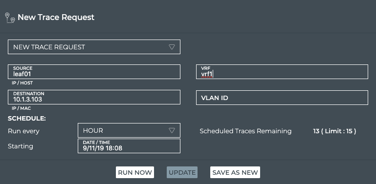 | VRF | Optional for layer 3 traces. Virtual Route Forwarding interface to be used as part of the trace path. |