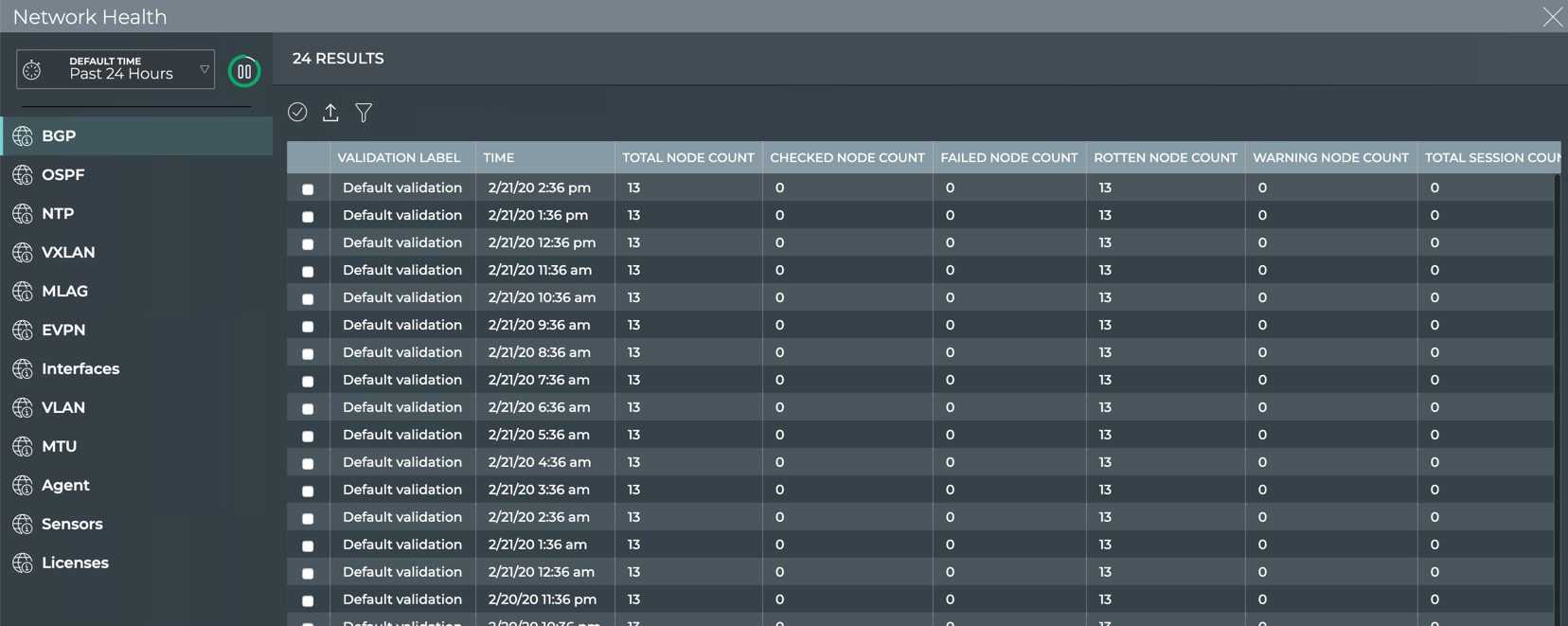 | Charts | Distribution of passing validations for BGP, CLAG, EVPN, LNV, NTP, and VXLAN services during the designated time period |