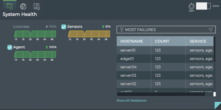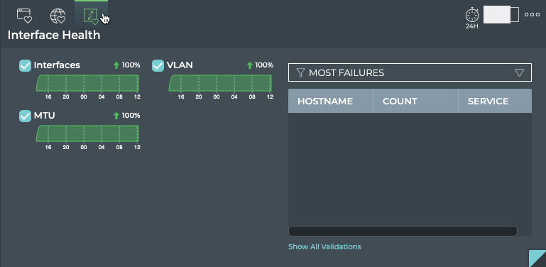 | Show All Validations | Opens full screen Network Health card with a listing of validations performed by network service and protocol |