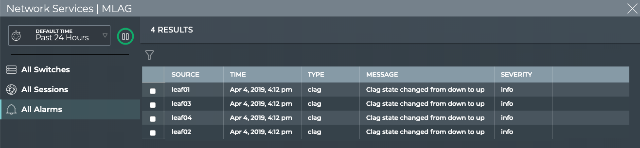 | All Alarms tab | Displays all MLAG events network-wide. By default, the event list is sorted by time, with the most recent events listed first. The tab provides the following additional data about each event: