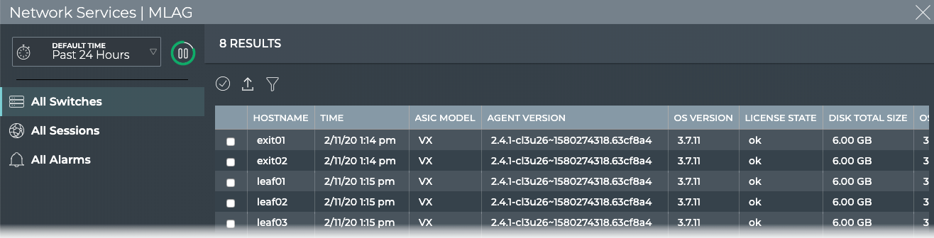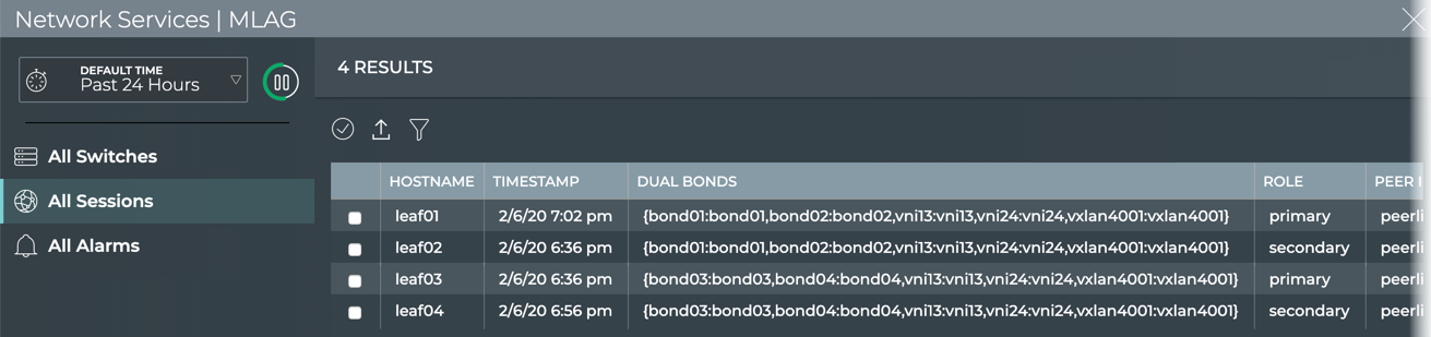 | All Sessions tab | Displays all MLAG sessions network-wide. By default, the session list is sorted by hostname. This tab provides the following additional data about each session: