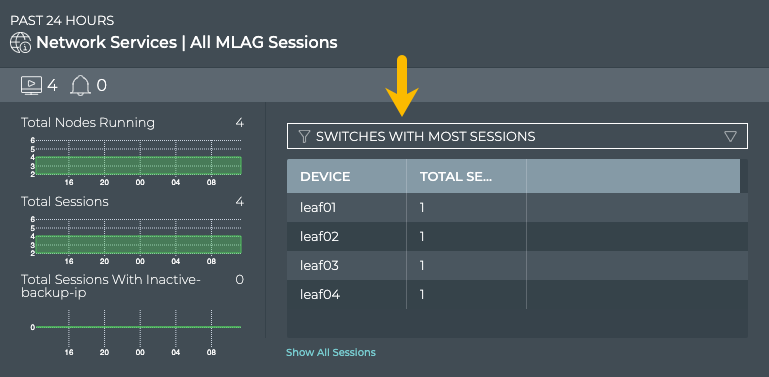 | Total Sessions chart | Distribution of MLAG sessions running during the designated time period, and the total number of sessions running on the network currently |