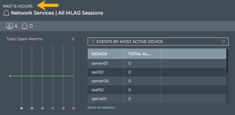 | Total Open Alarms chart | Distribution of MLAG-related alarms received during the designated time period, and the total number of current MLAG-related alarms in the network. Note: The alarm count here may be different than the count in the summary bar. For example, the number of new alarms received in this time period does not take into account alarms that have already been received and are still active. You might have no new alarms, but still have a total number of alarms present on the network of 10. |
