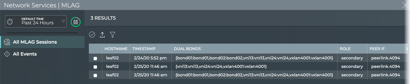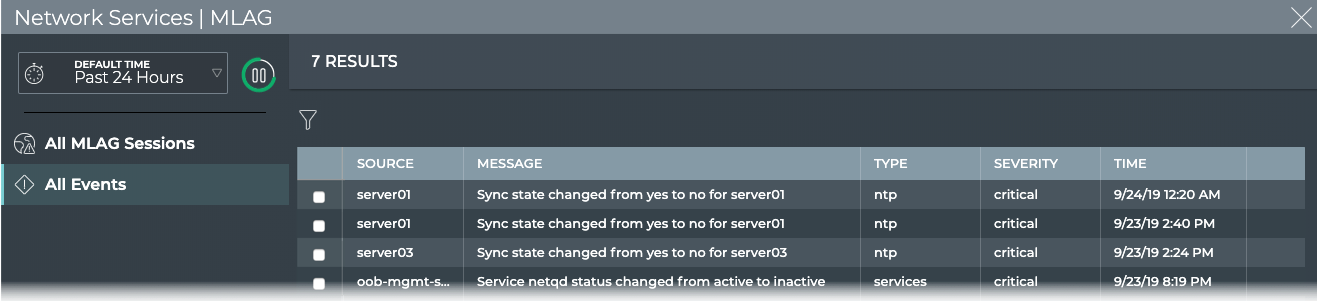 The MLAG Service card workflow enables you to view all of the MLAG events in the designated time period.