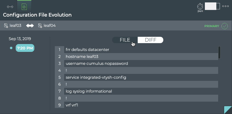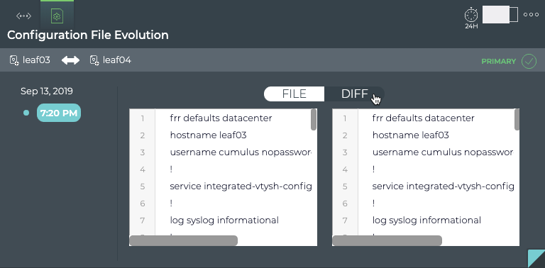 | Configuration File | When File is selected, the configuration file as it was at the selected time is shown. When Diff is selected, the configuration file at the selected time is shown on the left and the configuration file at the previous timestamp is shown on the right. Differences are highlighted. |