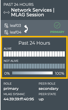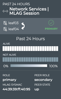You can view the peering state for a given MLAG session from the medium and large MLAG Session cards. For a given time period, you can determine the stability of the MLAG session between two devices. If you experienced connectivity issues at a particular time, you can use these cards to help verify the state of the peer. If the peer was not alive more than it was alive, you can then investigate further into possible causes.