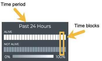 On the medium and large single MLAG session cards, the status of the peers is represented in heat maps stacked vertically; one for peers that are reachable (alive), and one for peers that are unreachable (not alive). Depending on the time period of data on the card, the number of smaller time blocks used to indicate the status varies. A vertical stack of time blocks, one from each map, includes the results from all checks during that time. The results are shown by how saturated the color is for each block. If all peers during that time period were alive for the entire time block, then the top block is 100% saturated (white) and the not alive block is zero percent saturated (gray). As peers that are not alive increase in saturation, the peers that are alive block is proportionally reduced in saturation. An example heat map for a time period of 24 hours is shown here with the most common time periods in the table showing the resulting time blocks.