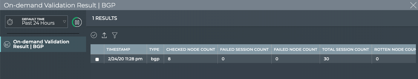 | On-demand Validation Result | <network protocol or service> | Displays all unscheduled validation results. By default, the results list is sorted by Timestamp. This tab provides the following additional data about each result: