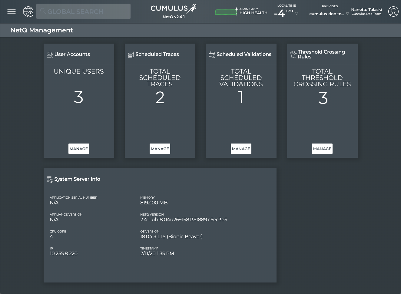 The NetQ Management workbench is accessed from the main menu. For the user(s) responsible for maintaining the application, this is a good place to start each day.