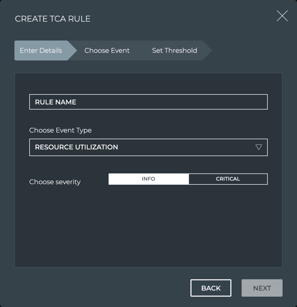 On the Enter Details step, enter a name for your rule, choose your TCA event type, and assign a severity.