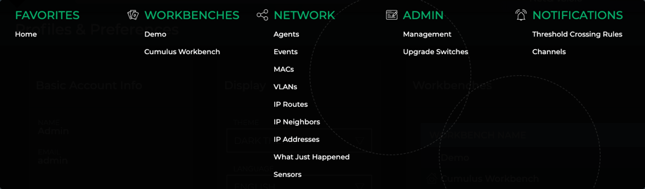 A workbench is comprised of a given set of cards. A pre-configured default workbench, Cumulus Workbench, is available to get you started. It contains Device Inventory, Switch Inventory, Alarm and Info Events, and Network Health cards. On initial login, this workbench is opened. You can create your own workbenches and add or remove cards to meet your particular needs. For more detail about managing your data using workbenches, refer to Focus Your Monitoring Using Workbenches.