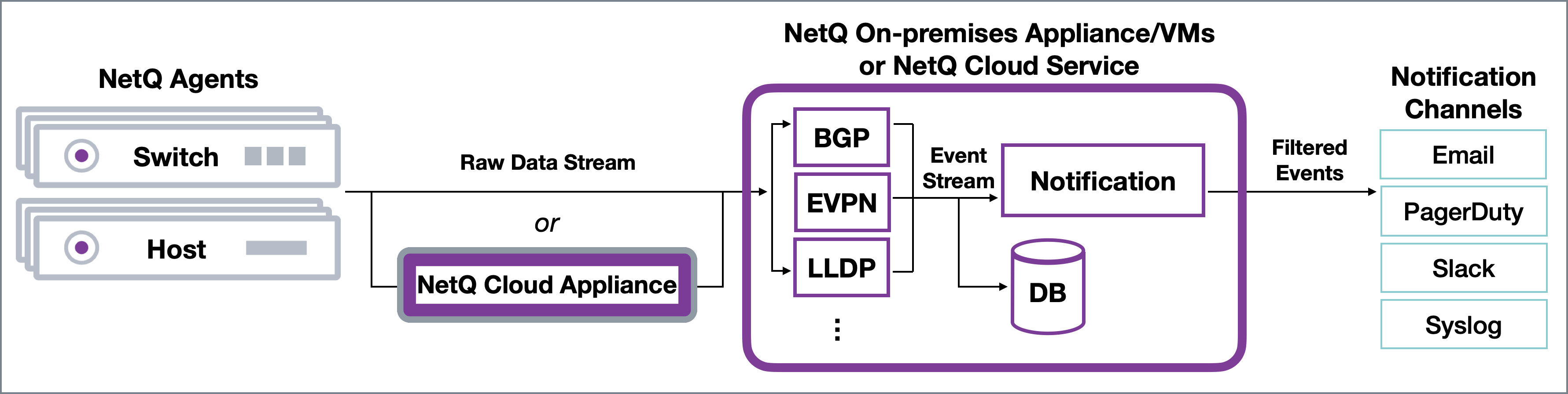 In an on-premises deployment, the NetQ On-premises Appliance or VM receives the raw data stream from the NetQ Agents, processes the data, stores, and delivers events to the Notification function. Notification then filters and sends messages to any configured notification applications. In a cloud deployment, the NetQ Cloud Appliance or VM passes the raw data stream on to the NetQ Cloud service for processing and delivery.