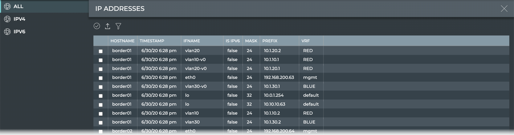 The IP Addresses view provides all available parameter data about all IP addresses. The list of addresses can be filtered to view only the IPv4 or IPv6 addresses by selecting the relevant tab.