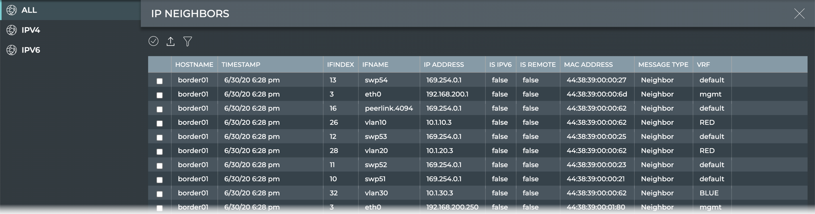 The IP Neighbors view provides all available parameter data about all IP neighbors. The list of neighbors can be filtered to view only the IPv4 or IPv6 neighbors by selecting the relevant tab.