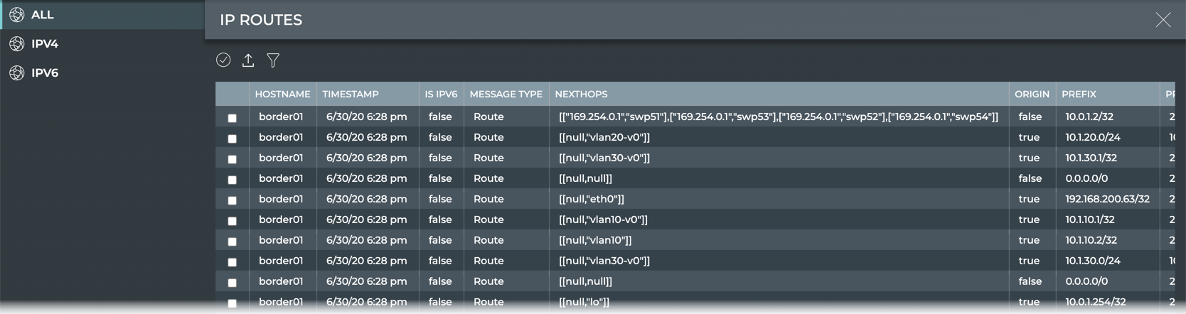 The IP Routes view provides all available parameter data about all IP routes. The list of routes can be filtered to view only the IPv4 or IPv6 routes by selecting the relevant tab.
