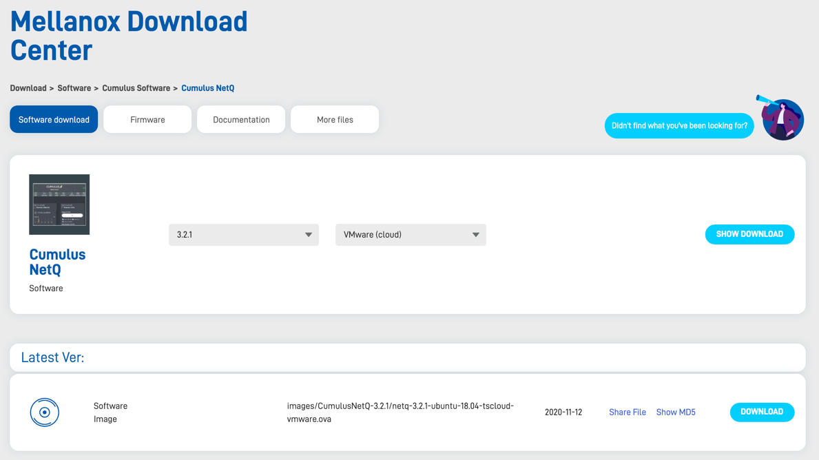 Existing customer who has downloaded Cumulus Networks software before September 1, 2020:- On the MyMellanox Downloads page, select NetQ from the Software -> Cumulus Software list.