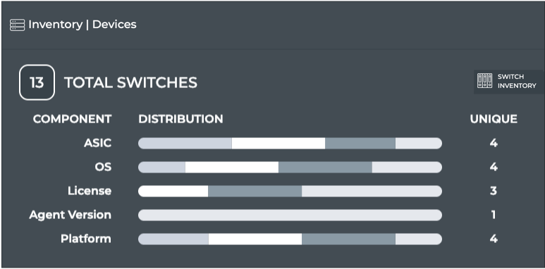 | Unique | Number of unique versions of the various switch components. For example, for OS, you might have CL 3.7.1 and CL 3.7.4 making the unique value two. |