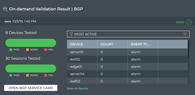 To view all data available for all scheduled validation results for the given protocol or service, click Show All Results or switch to the full screen card.