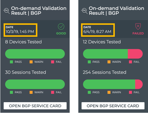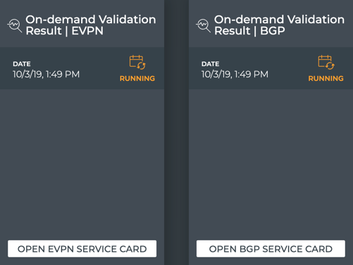 The associated on-demand validation result cards (one per protocol and service selected) are accessible from the full-screen Validation Request card. Refer to View On-demand Validation Results.