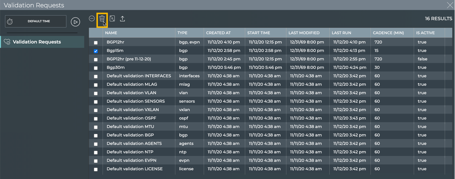 You can remove a user-defined scheduled validation at any time using the NetQ UI or the NetQ CLI. Default validations cannot be removed.