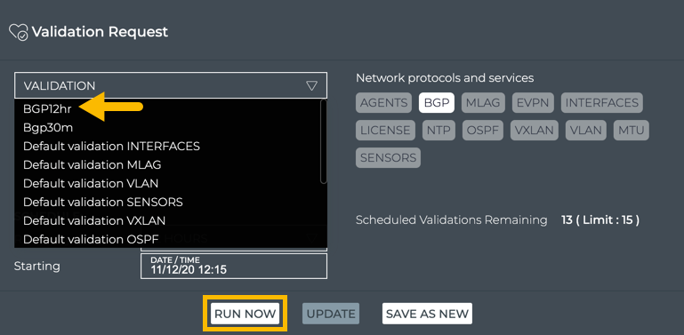 This example shows a scheduled validation for BGP to run avery 12 hours beginning November 12th at 12:15 p.m.