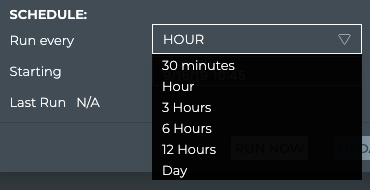 - Enter the schedule frequency (30 min, 1 hour, 3 hours, 6 hours, 12 hours, or 1 day) by selecting it from the Run every list. Default is hourly.