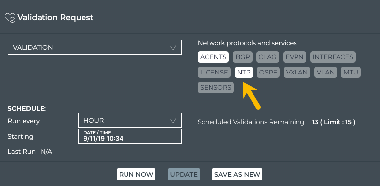 On the right side of the card, select the protocols and services you want to include in the validation. In this example we have chosen the Agents and NTP services.