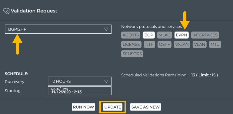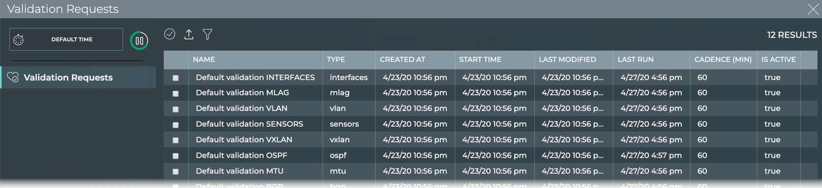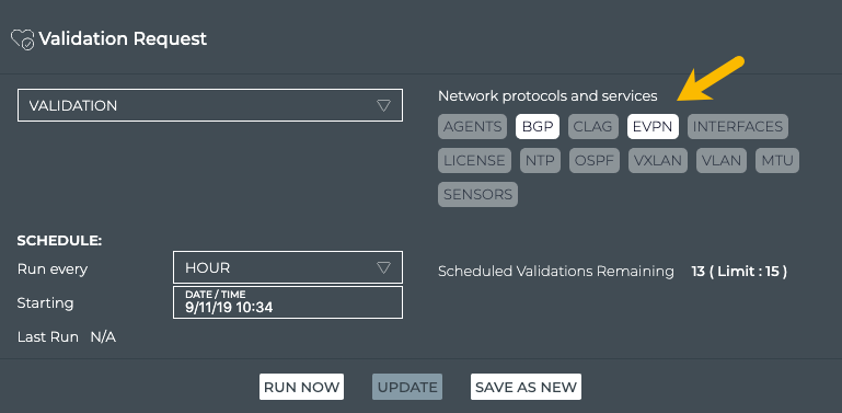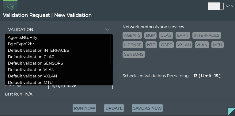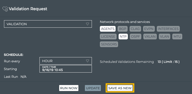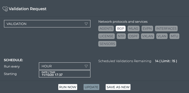 When you want to see validation results on a regular basis, it is useful to configure a scheduled validation request to avoid re-creating the request each time. You can create up to 15 scheduled validations for a given NetQ system.