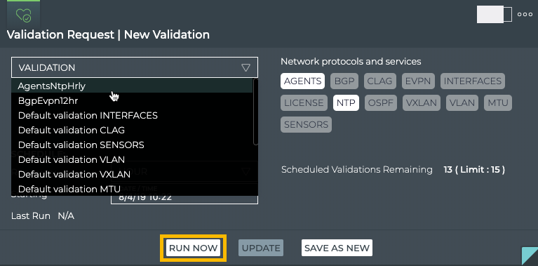 The validation can now be selected from the Validation listing (on the small, medium or large size card) and run immediately using Run Now, or you can wait for it to run the first time according to the schedule you specified. Refer to View Scheduled Validation Results. Note that the number of scheduled validations is now two (15 allowed minus 13 remaining = 2).