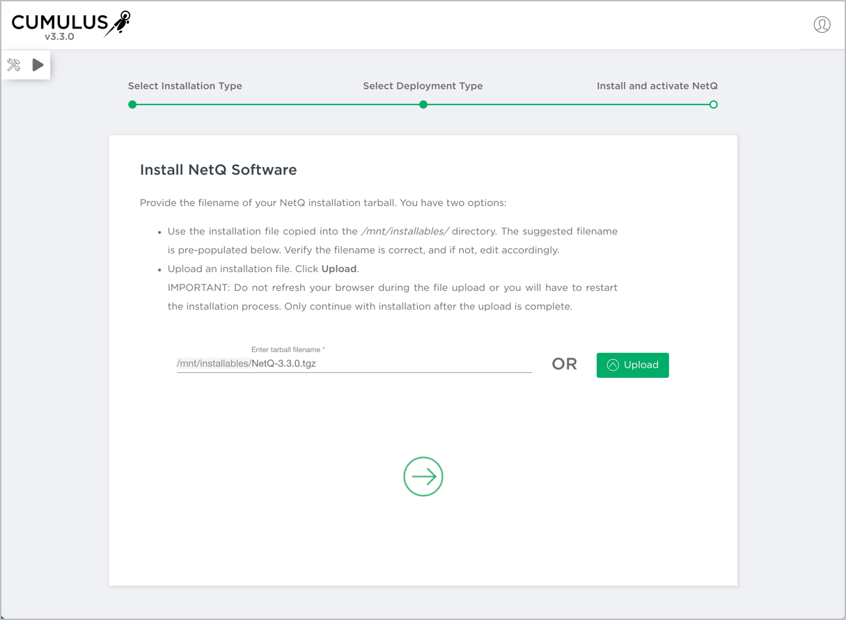 NetQ-3.3.0-tgzfor on-premises deployments orNetQ-3.3.0-opta.tgzfor cloud deployments) that you downloaded and stored previously.For on-premises: Accept the path and filename suggested, or modify these to reflect where you stored your installation file, then click