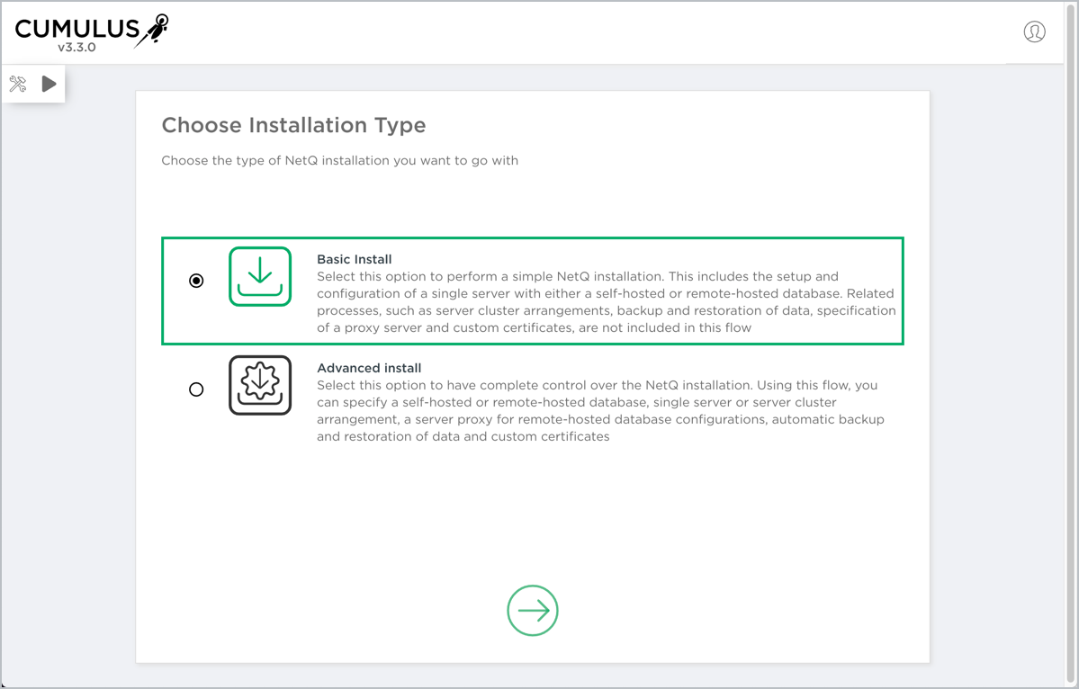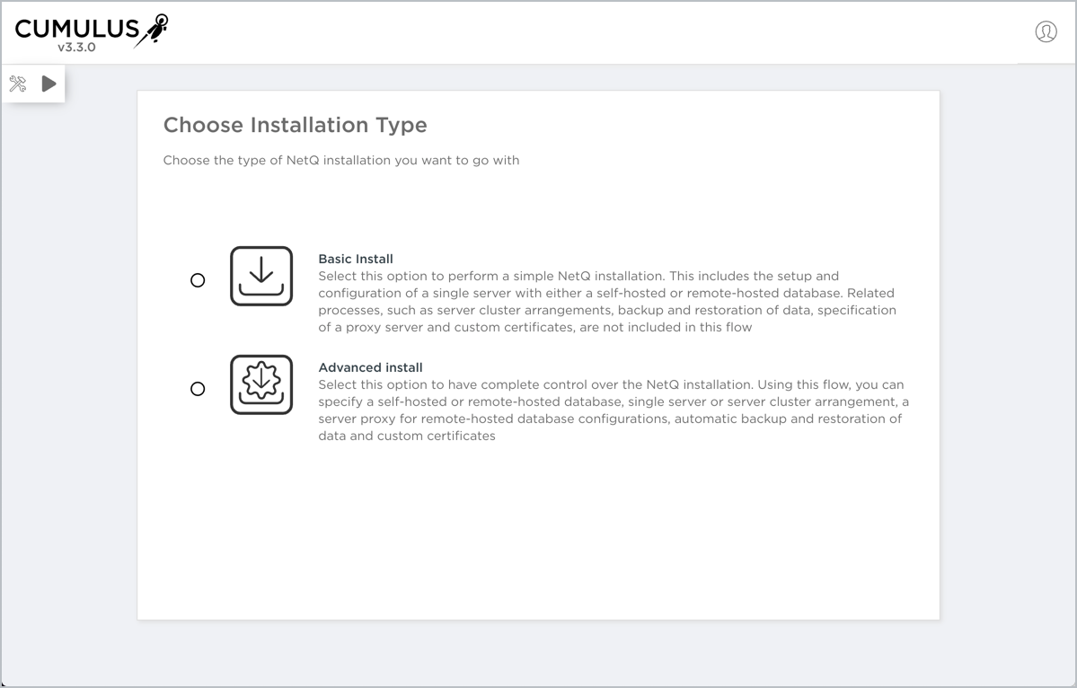 You can now install the NetQ software using the Admin UI using the default basic installation or an advanced installation.