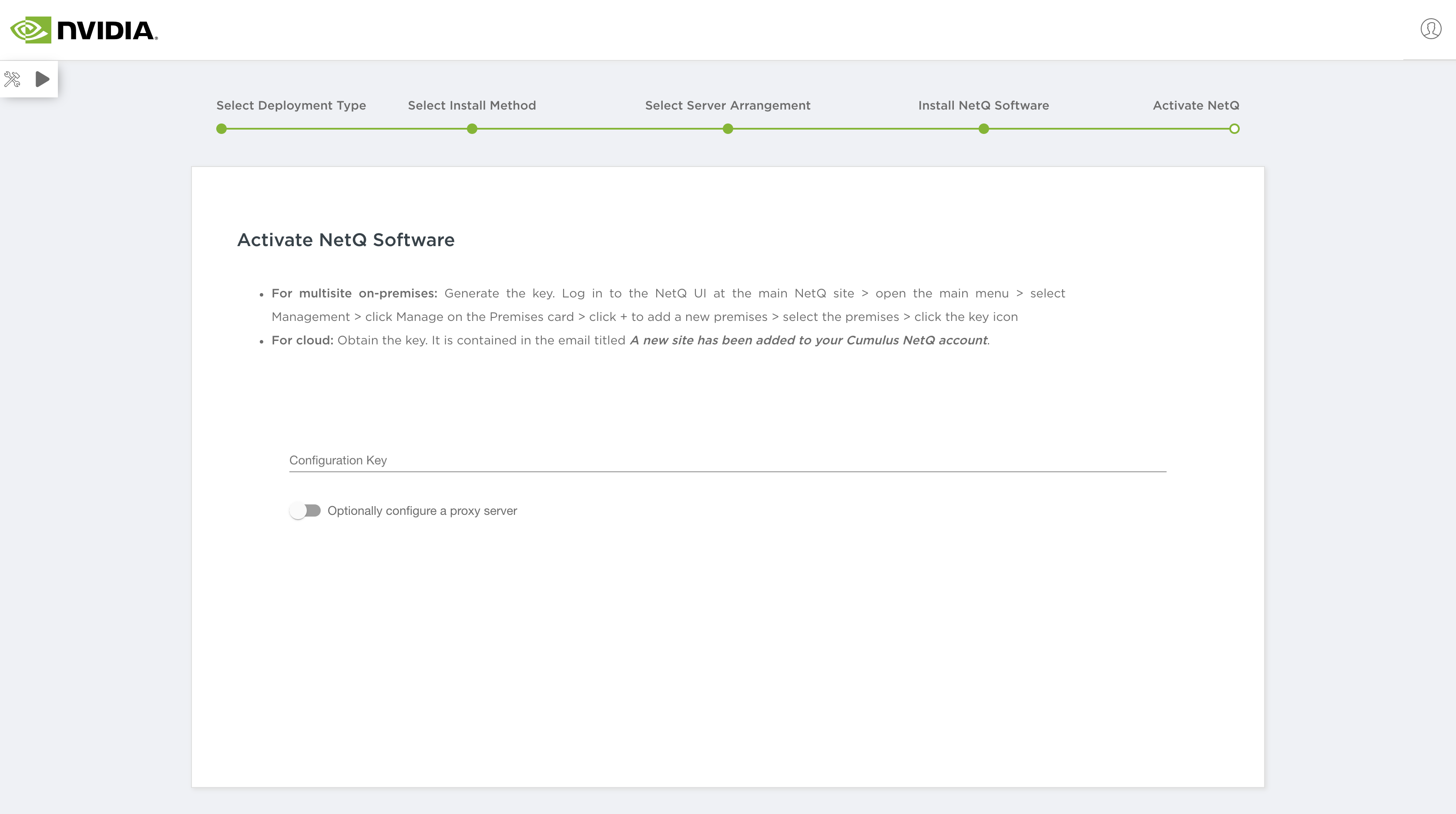 This final step activates the software and enables you to view the health of your NetQ system. For remote deployments, you must enter your configuration key.