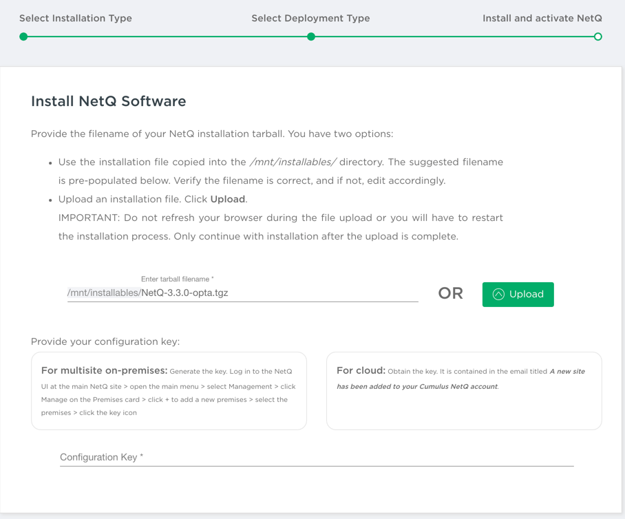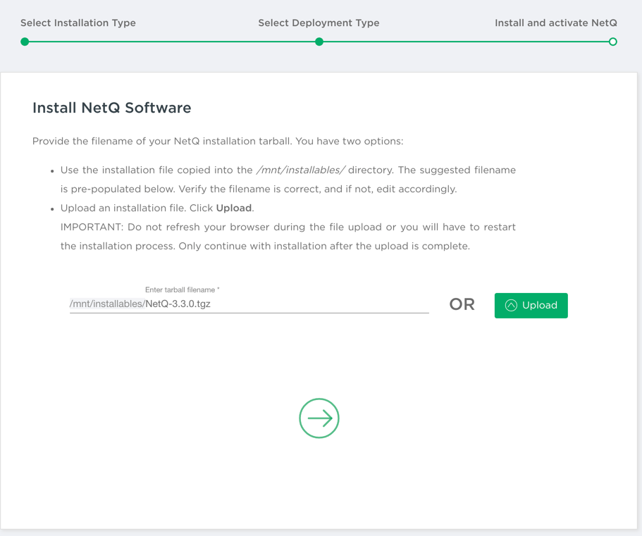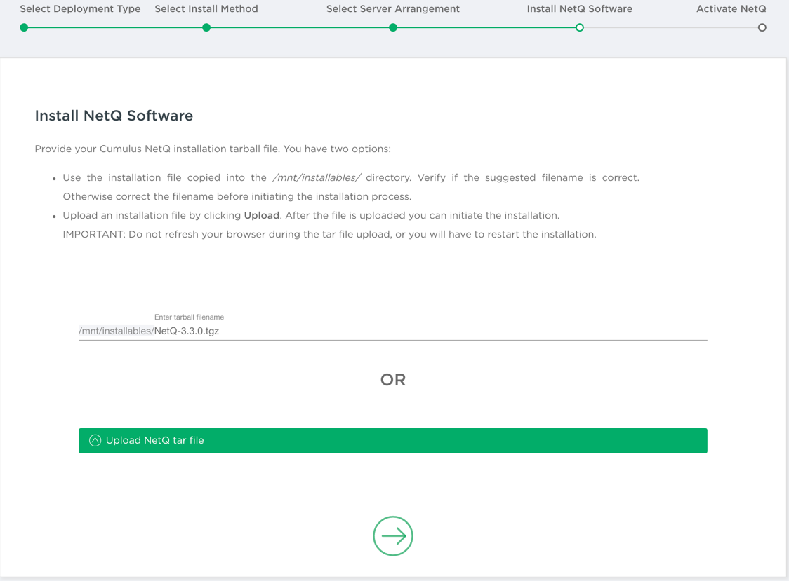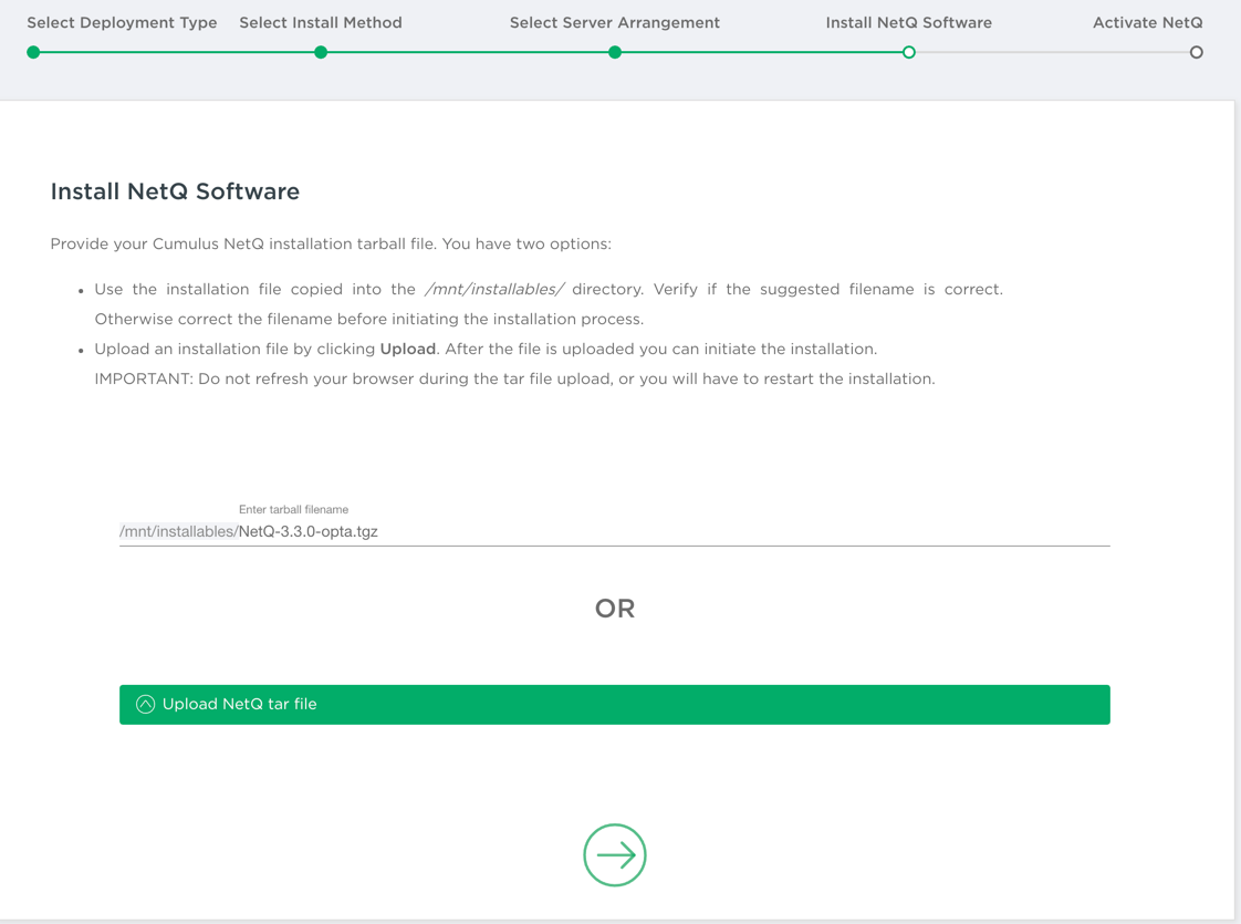- Enter or upload the NetQ 4.0.0 tarball.