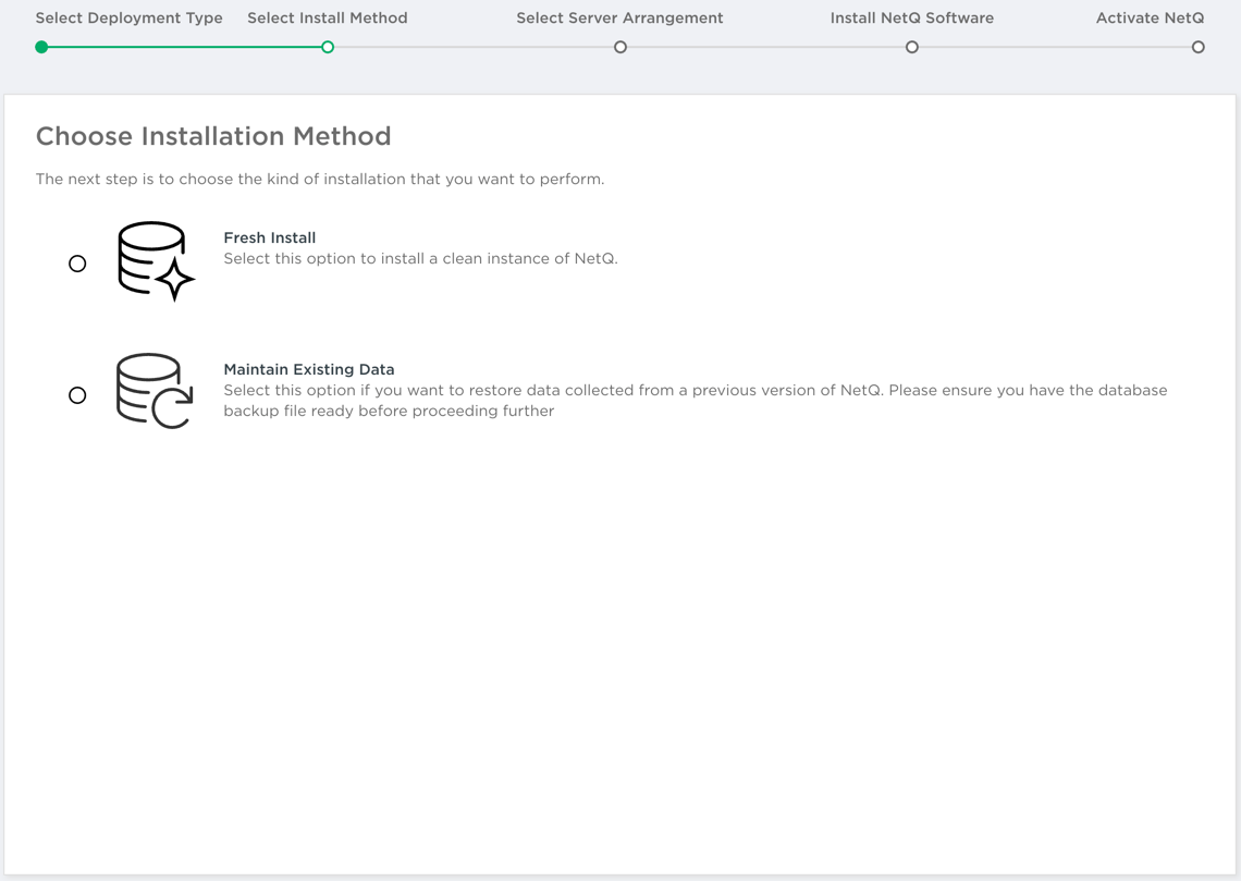 Choose between restoring data from a previous version of NetQ or performing a fresh installation.