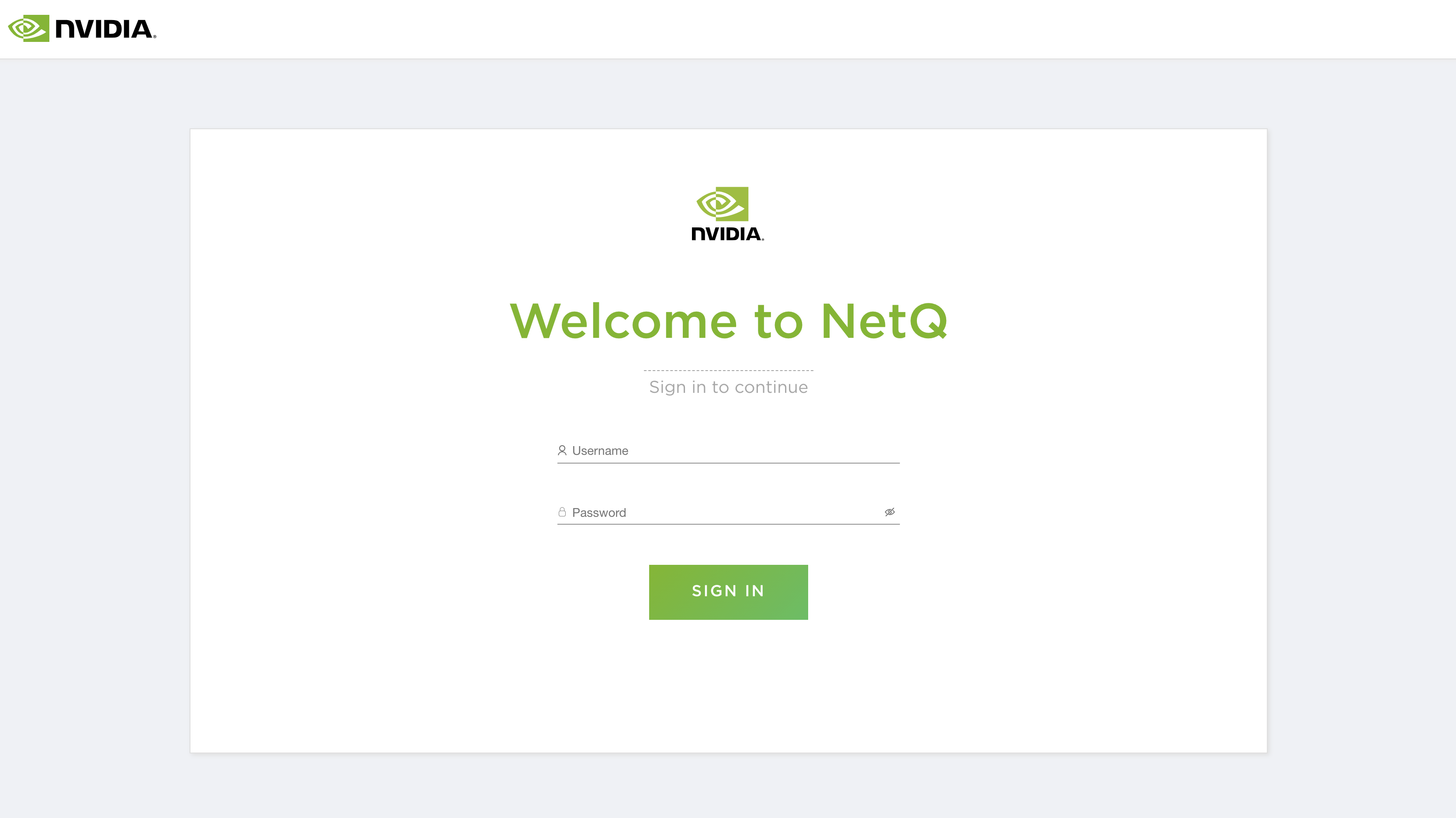 Enter your NetQ credentials to enter the application. The default username is admin and the default password in admin.