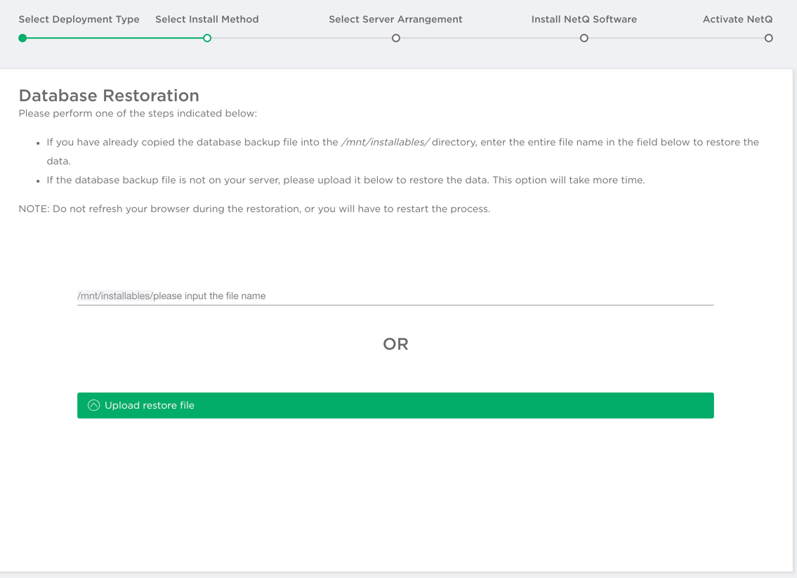 - Maintain Existing Data (on-premises only): If you have created a backup of your NetQ data, choose this option. Enter the restoration filename in the field provided and click