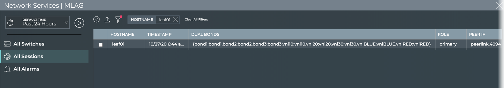 You can view the load from MLAG on your switches using the large Network Services|All MLAG Sessions card. This data enables you to see which switches are handling the most MLAG traffic currently, validate that is what you expect based on your network design, and compare that with data from an earlier time to look for any differences.