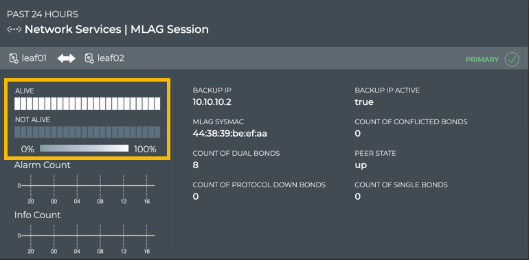 You can view the peering state for a given MLAG session from the medium and large MLAG Session cards. For a given time period, you can determine the stability of the MLAG session between two devices. If you experienced connectivity issues at a particular time, you can use these cards to help verify the state of the peer. If the peer was not alive more than it was alive, you can then investigate further into possible causes.