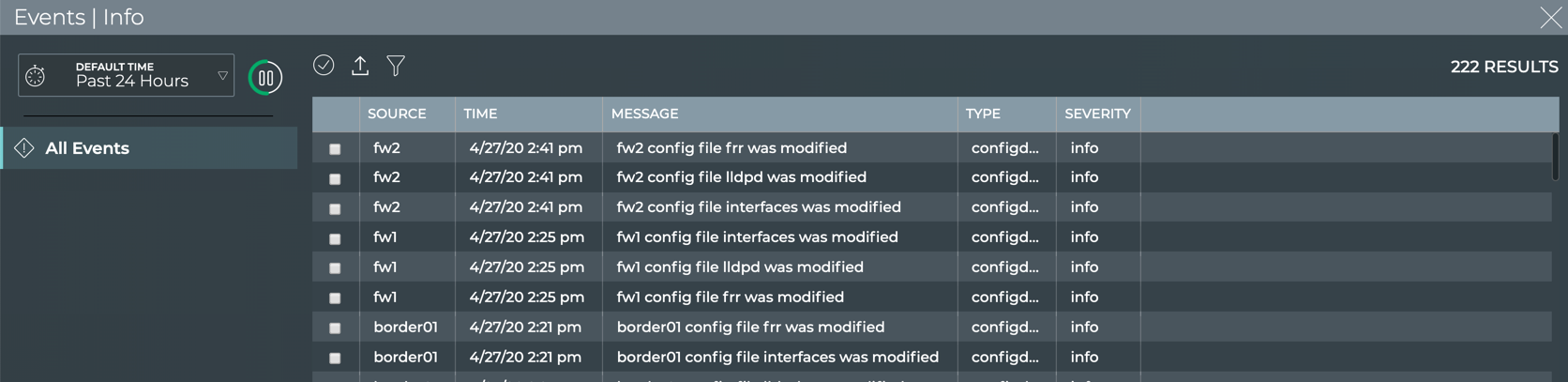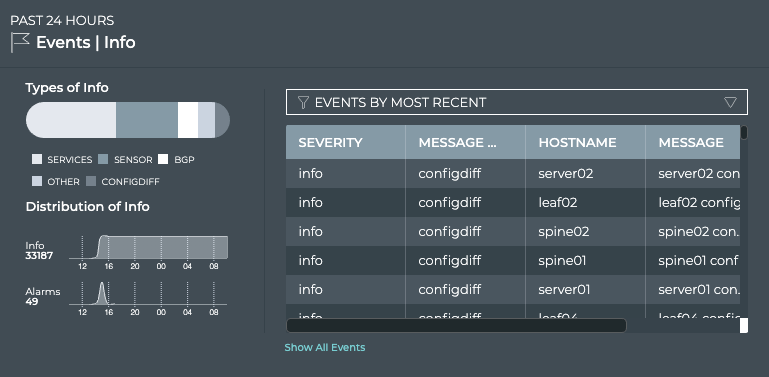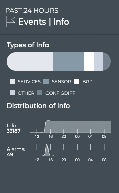 You can easily monitor warning, info, and debug severity events occurring across your network using the Info card. You can determine the number of events for the various system, interface, and network protocols and services components in the network.