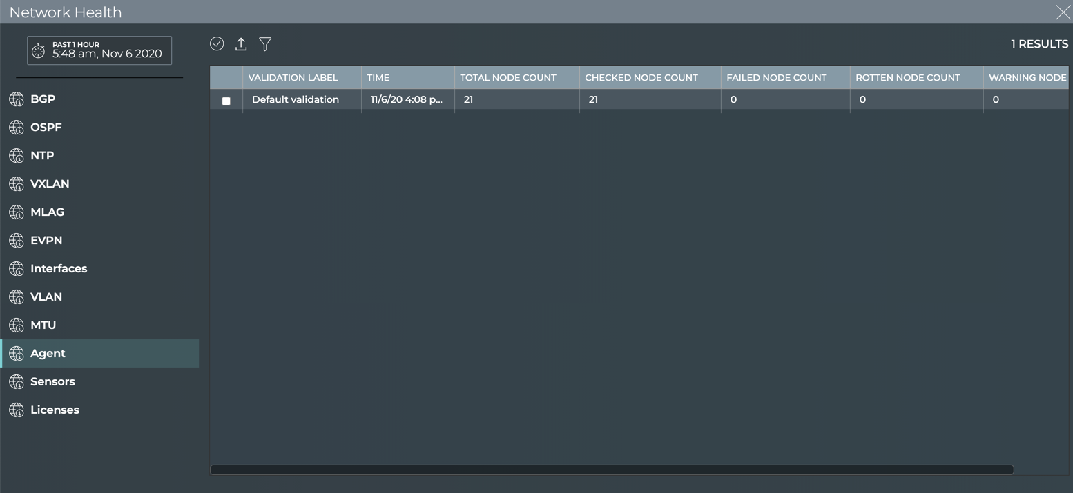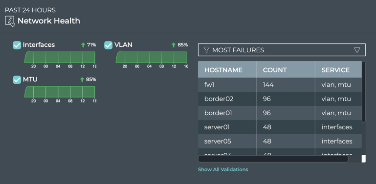 You can view a very simple summary of your network health, including the percentage of successful validation results, a trend indicator, and a distribution of the validation results.